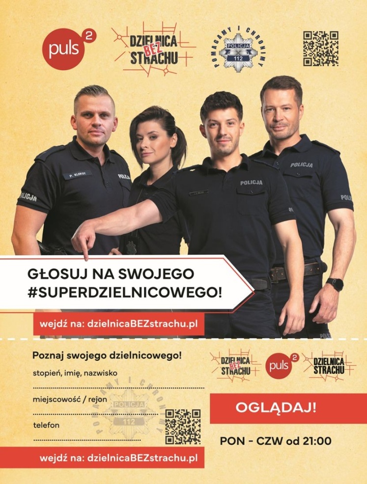 Możesz nagrodzić swojego dzielnicowego za dobrą pracę i zagłosować na niego w plebiscycie #SuperDzielnicowy 2024. Plebiscyt jest jednym z wydarzeń realizowanej w tym roku wspólnej akcji społecznej Komendy Głównej Policji oraz Telewizji Puls #DzielnicaBEZstrachu. Głosować można do końca kwietnia.