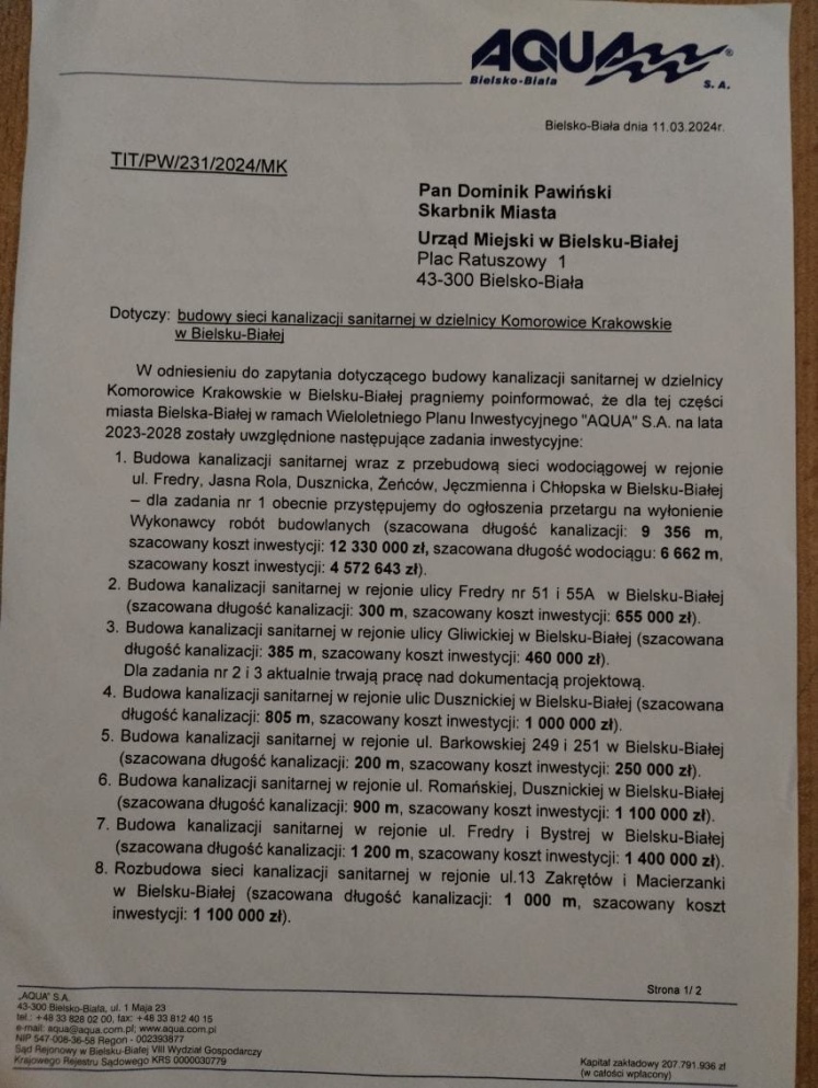 Gdzie Aqua planuje wybudować kanalizację? 18 marca 2024 2277 Spółka Aqua przygotowała odpowiedź na pytania mieszkańców, które padły w trakcie tegorocznego zebrania sprawozdawczego Rady Osiedla Komorowice Krakowskie. Z pisma dowiadujemy się o planach inwestycyjnych spółki na lata 2023-2028.