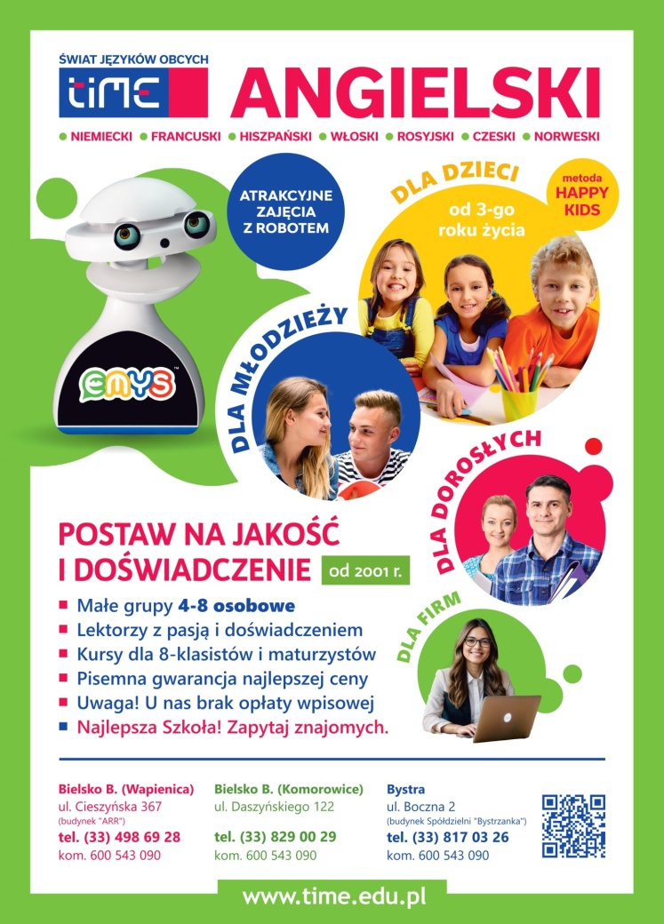 Po 21 latach działalności przy ulicy Katowickiej 63 Szkoła Języków Obcych TIME zmienia swoją siedzibę. W związku ze sprzedażą całego budynku należącego wcześniej do Spółdzielni SCh wszystkie zajęcia językowe będą odbywały się od października b.r. przy ulicy Daszyńskiego 122 - w samym centrum Komorowic Karkowskich.