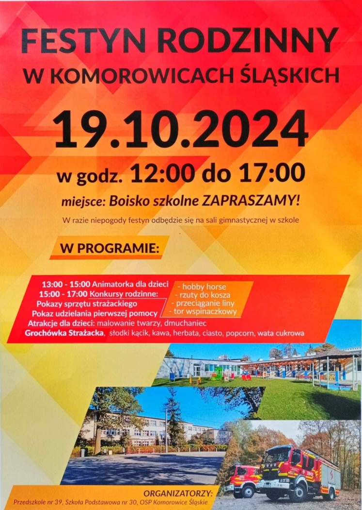 Przedszkole nr 39, Szkoła Podstawowa nr 30 i OSP Komorowice Śląskie zapraszają na festyn rodzinny, który odbędzie się w sobotę 19 października na boisku SP30.