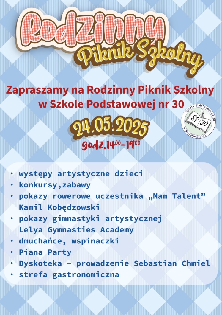 Już 24 maja 2025 roku w godzinach od 14:00 do 19:00 na terenie Szkoły Podstawowej nr 30 w Bielsku-Białej odbędzie się Rodzinny Piknik Szkolny. Na to wyjątkowe wydarzenie serdecznie zapraszają Rada Rodziców oraz Dyrekcja szkoły. Będzie to doskonała okazja do wspólnego spędzenia czasu, integracji środowiska szkolnego oraz świetnej zabawy w rodzinnej atmosferze.