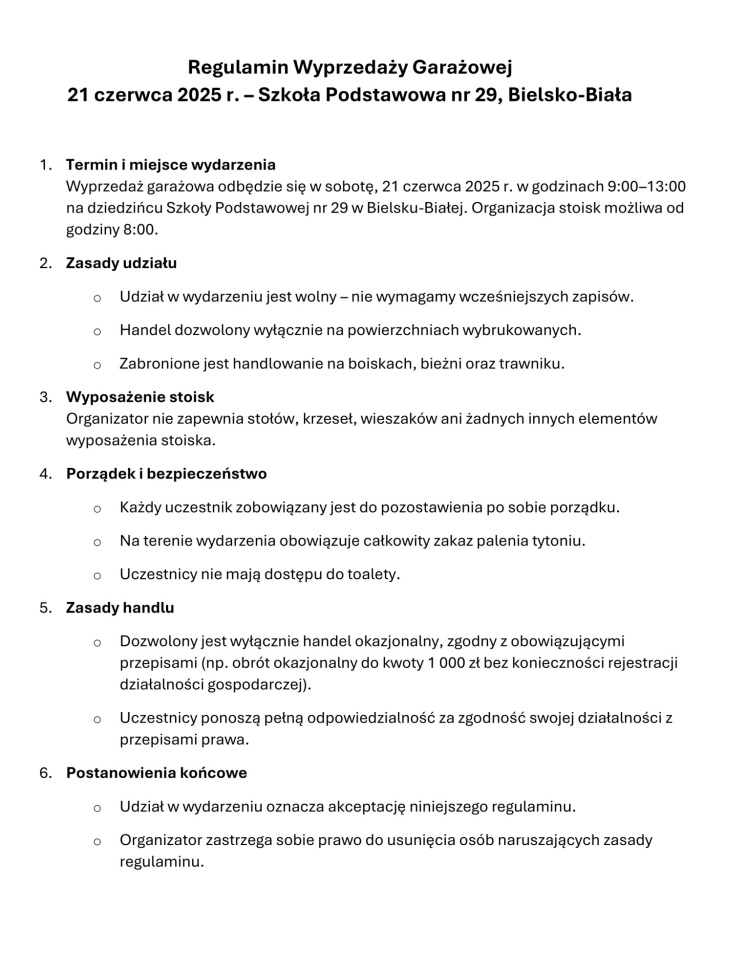 Dzięki ogromnej życzliwości i otwartości dyrekcji szkoły, mieszkańcy będą mogli wystawiać swoje stoiska na wybrukowanym dziedzińcu Szkoły Podstawowej nr 29. Ważne! Handlować można tylko na wyznaczonym terenie dziedzińca - nie przenosimy się na boiska, bieżnię czy trawniki.