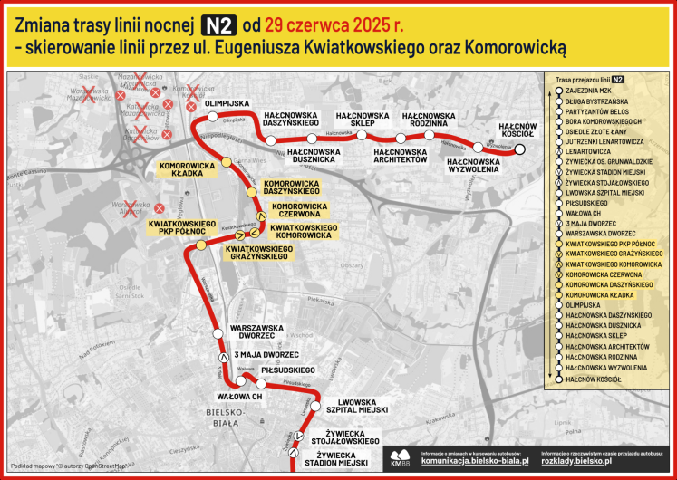 Od 29 czerwca 2025 r. (niedziela) wprowadzona zostaje nowa trasa przejazdu linii nocnej N2 przez ul. Eugeniusza Kwiatkowskiego oraz Komorowicką. Obsługiwane będą przystanki: “Kwiatkowskiego PKP Północ”, “Kwiatkowskiego Grażyńskiego” (NŻ), “Kwiatkowskiego Komorowicka”, “Komorowicka Czerwona”, “Komorowicka Daszyńskiego” oraz “Komorowicka Kładka”. Pominięte zostają przystanki: “Warszawska Aluprof”, “Warszawska Mazańcowicka”, “Mazańcowicka Katowicka”, “Katowicka Mazańcowicka”, “Katowicka Ogrodników”, “Komorowicka Kościół”.