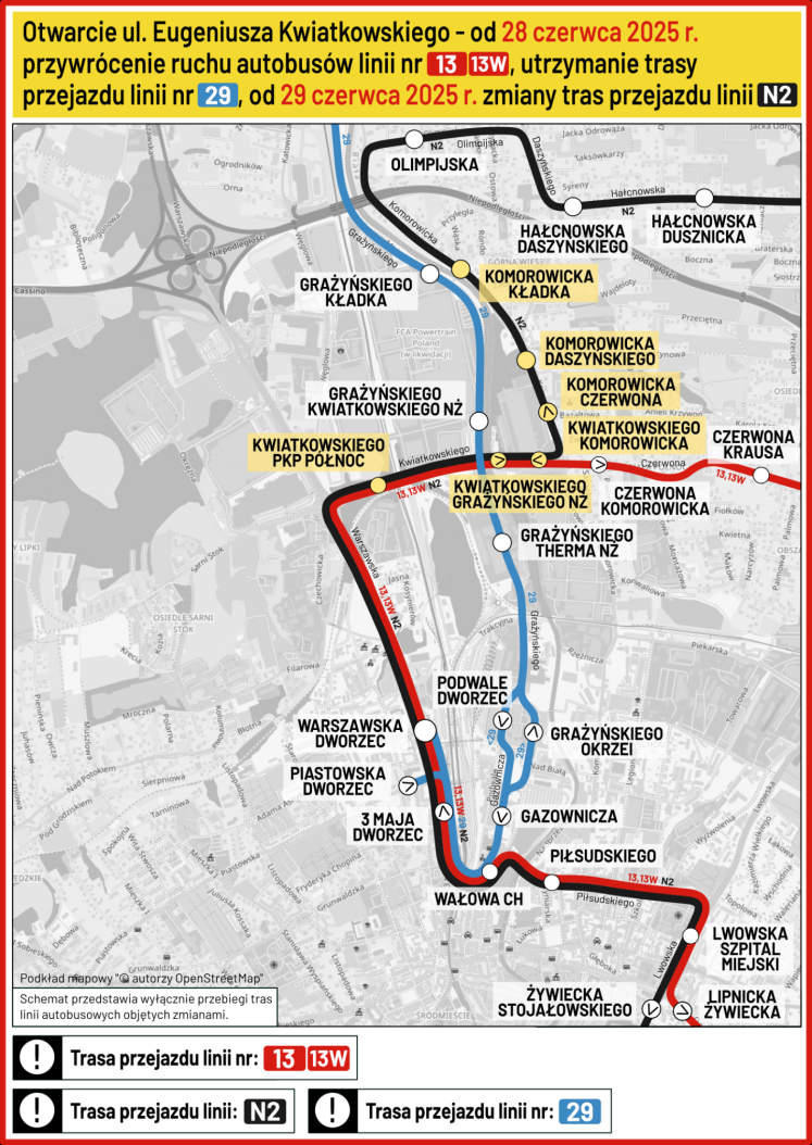 Od 28 czerwca 2025 r. (sobota) przywrócona zostaje podstawowa trasa przejazdu linii nr 13 i 13W przez ul. Eugeniusza Kwiatkowskiego, Warszawską oraz 3 Maja. Obsługiwane będą przystanki: “Kwiatkowskiego PKP Północ”, “Warszawska Dworzec” i “3 Maja Dworzec”. Pominięte zostają przystanki: “Grażyńskiego Okrzei”, “Gazownicza”, “Podwale Dworzec”, “Grażyńskiego Therma” (NŻ).