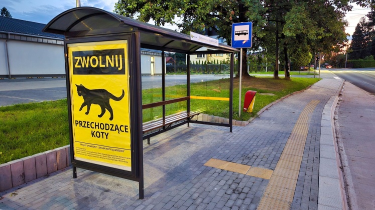 Ciekawostką jest fakt, że na ścianie przystankowej zwraca uwagę żywy, żółto‑czarny plakat z napisem „Zwolnij! Przechodzące koty”. To element ogólnomiejskiej, ekologiczno-społecznej kampanii „Uwaga! Koty są wszędzie”. Kampania promuje empatyczne podejście do kotów wolno żyjących i zwiększa świadomość kierowców, by chronić zwierzęta w ruchu miejskim.