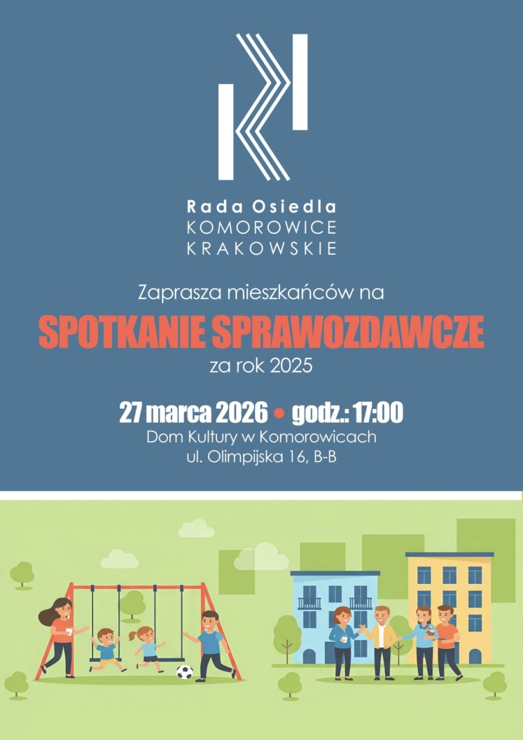 Rada Osiedla Komorowice Krakowskie zaprasza mieszkańców na Spotkanie Sprawozdawcze za rok 2025, które odbędzie się 27 marca o godzinie 17:00 w Domu Kultury w Komorowicach (ul. Olimpijska 16 w Bielsku-Białej).