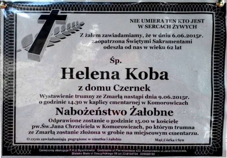 Zmarła pani Helena Koba 9 czerwca 2015 3708 Smutna wiadomość z rana. Zmarła pani Helena Koba, przez wiele lat uczyła chemii w SP nr 29 i Gimnazjum nr 14. Nabożeństwo żałobne zostanie odprawione we wtorek 9 czerwca o godzinie 15.00. Rodzinie składamy kondolencje.