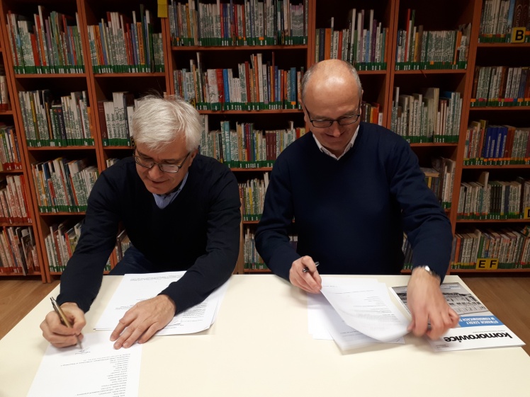 W gościnnych pomieszczeniach komorowickiej biblioteki, prezesi Stowarzyszenia Komorowice - Roman Szabla i Ariel Brończyk podpisali umowy z autorami, którzy podjęli się prac nad opracowaniem dziejów naszej dzielnicy. W wydarzeniu udział wzięli również członkowie Stowarzyszenia: Urszula Szabla i ks. Jacek Pędziwiatr.